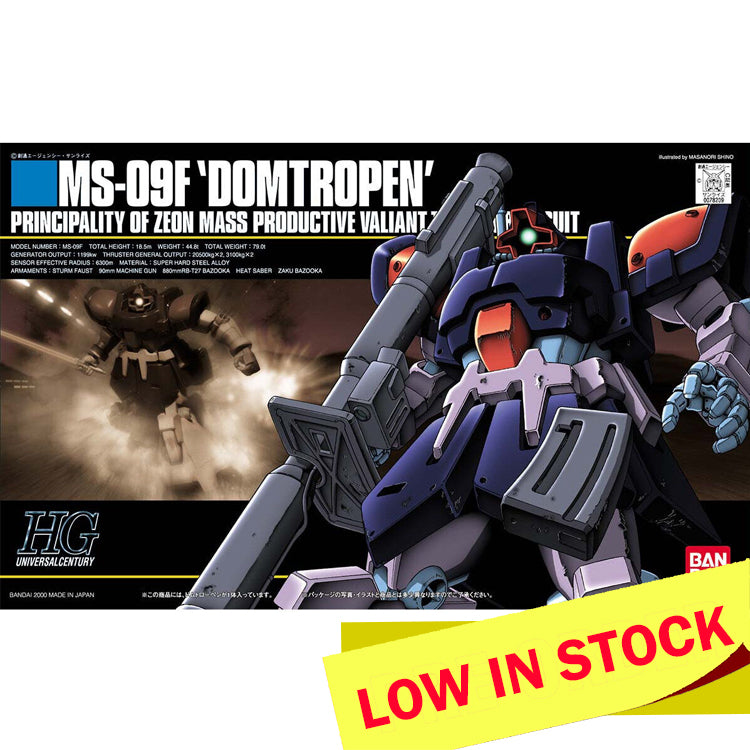 Based on Mobile Suit Gundam 0083: Stardust Memory, the MS-09F Dom Tropen model kit is in 1/144 scale and becomes a fully articulated figure once complete. The MS-09F Dom Tropen includes a beam saber and hyper bazooka with extra clip.