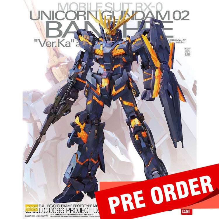 The Banshee from "Gundam Unicorn" re-appears as a Ver. Ka model kit! This version replicates its appearance in the novel before being adapted into an animated work where it was a black and gold colored Gundam Unicorn with a different head crest. Can transform between Unicorn and NT-D Modes and includes Beam Magnum, 4 Beam Sabers, transforming shield, and bazooka. This special release comes with a large sheet of gold colored water slide decals. Runner x 22, Foil Sticker, Water Decal, instruction Manual