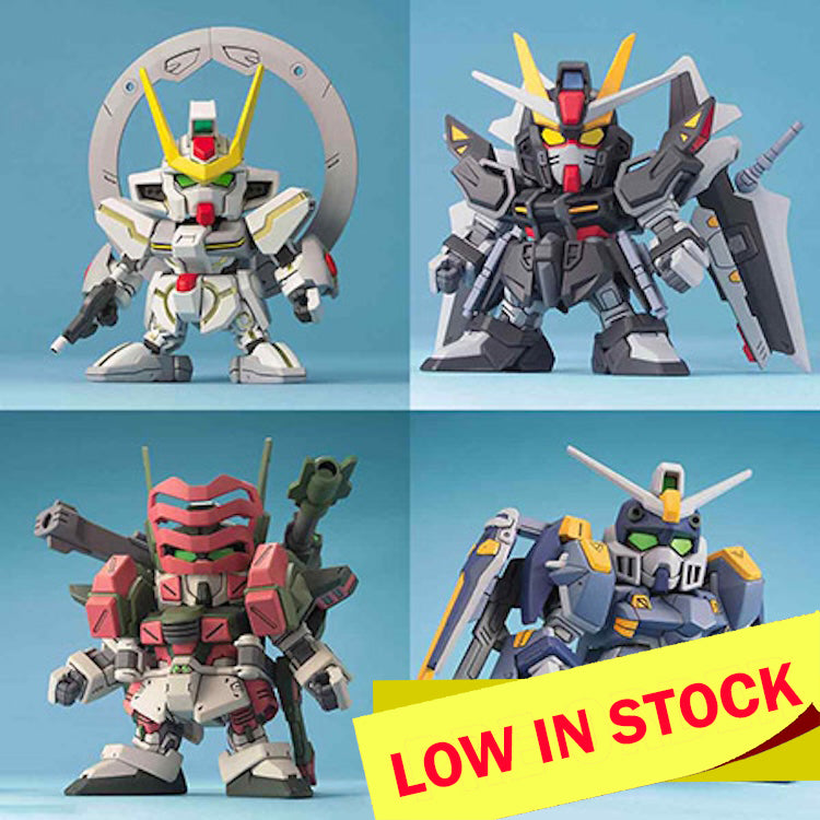 From Mobile Suit Gundam SEED C.E.73 -STARGAZER-, the popular SD Gundams are back as a set: "Strike Noir Gundam", "Verde Buster Gundam", "Bull Duel Gundam", and "Stargazer Gundam".