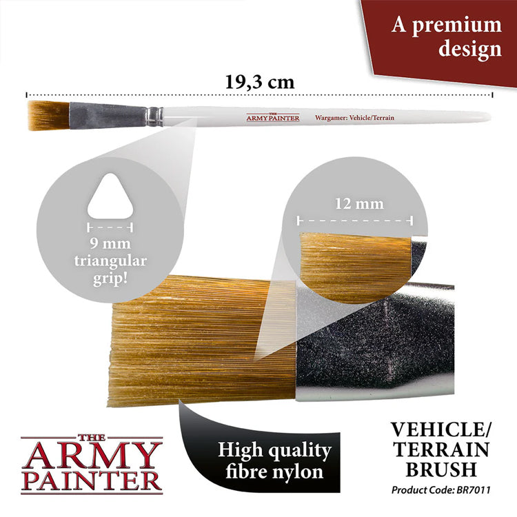 The Vehicle brush has a flat stiff end making it perfect for highligting edges on tanks and drybrushing anything from scenery to most vehicles. Also large monsters benefit from this brush where it is used as an enormous drybrush.