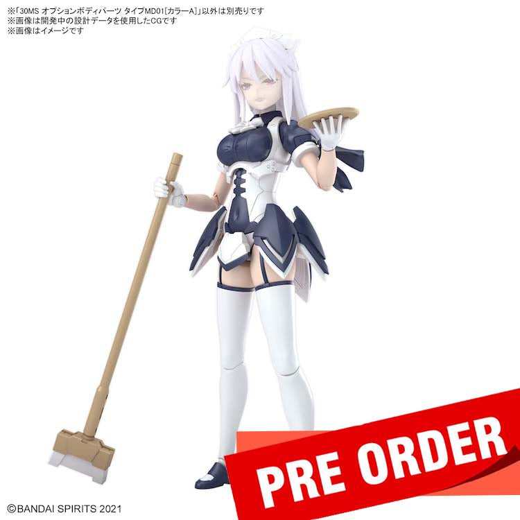 The MD01 Option Body Parts set includes a cute apron dress-inspired outfit. Brush parts, round tray parts, and a headdress are also included for assembly.