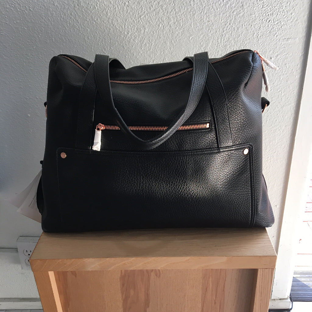 Fabrics - Vegan leather exterior; Memory foam changing pad included; Light-colored lining; Agion-treated interior resists bacteria, mold and mildew