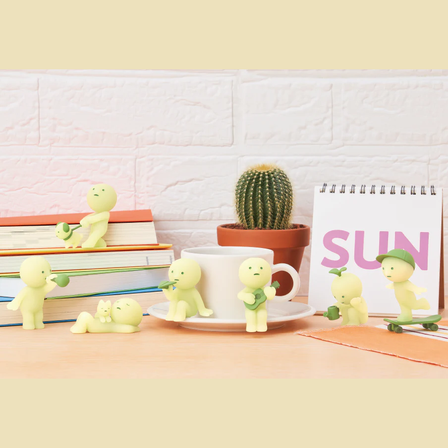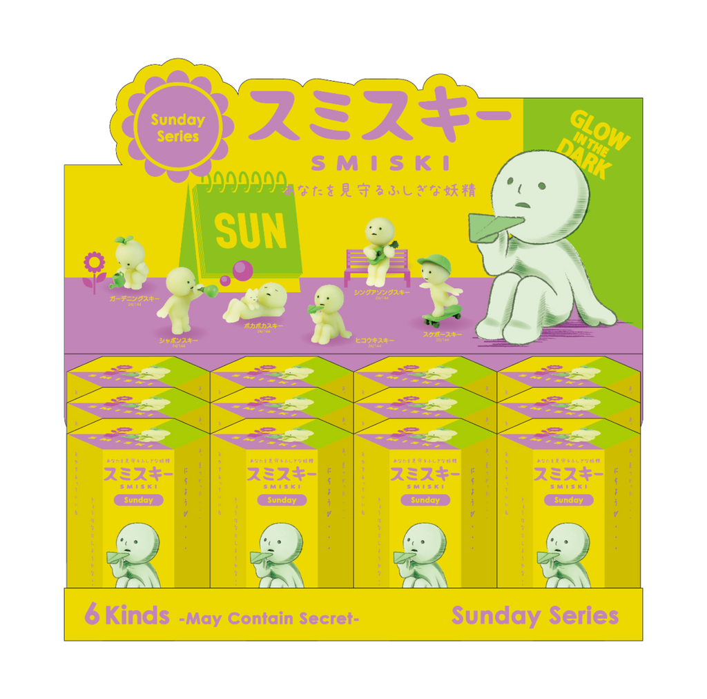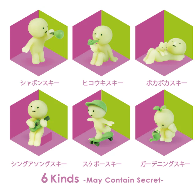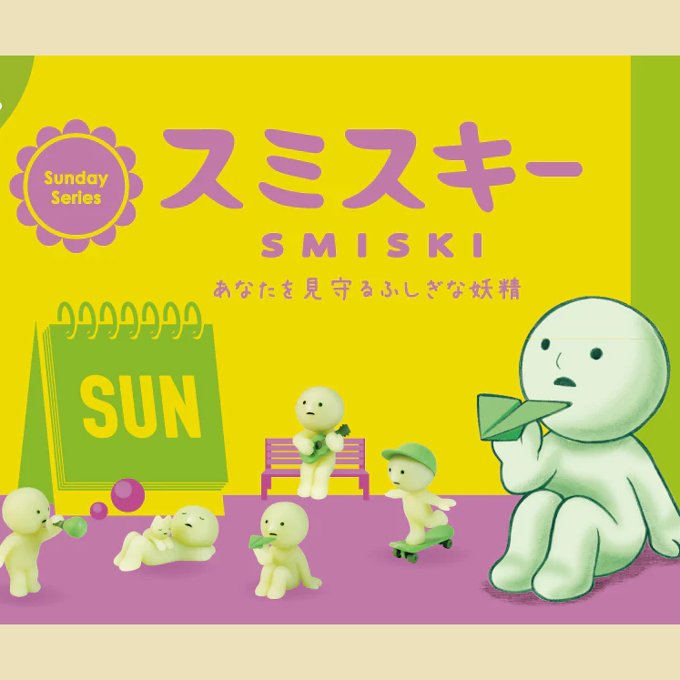 The lineup features 6 kinds + 1 secret figure and includes “SMISKI Sing-Along” who sings and plays guitar, “SMISKI Sunbathing” who naps in the warm sun with a furry friend, and “SMISKI Skateboarding” who’s ready for fun on the go. A day off spent with SMISKI is always refreshing.