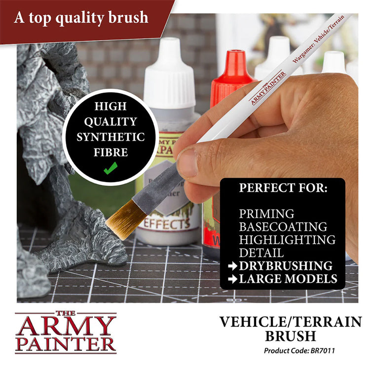 The Vehicle brush has a flat stiff end making it perfect for highligting edges on tanks and drybrushing anything from scenery to most vehicles. Also large monsters benefit from this brush where it is used as an enormous drybrush.
