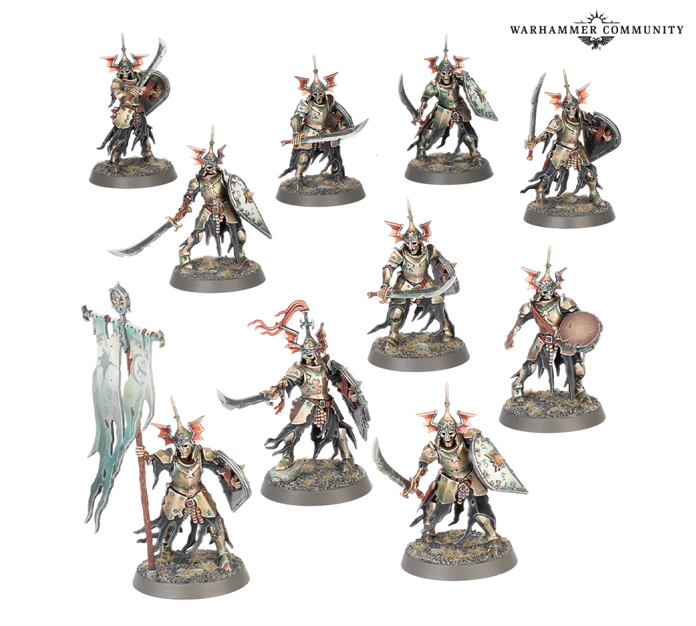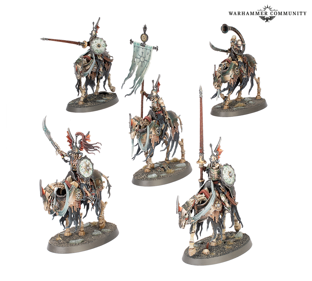 An imperious Wight King on Skeletal Steed leads this legion, while you can also build him as a lesser Wight Lord. He leads a unit of five mighty Barrow Knights, and 20 Barrow Guard, an elite retinue committed to an early grave by their liege.