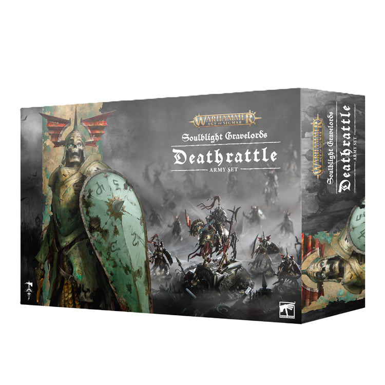 The Soulblight Gravelords have reanimated the pitiless skeletal hosts of the Barrow Kingdoms, deathless vassals whose monarchs pledged their eternal servitude in a vain effort to escape their own mortality. They arrive in the Deathrattle Army Set, with 26 new miniatures, a Battletome, and a set of warscroll cards – which is only available while stocks last.