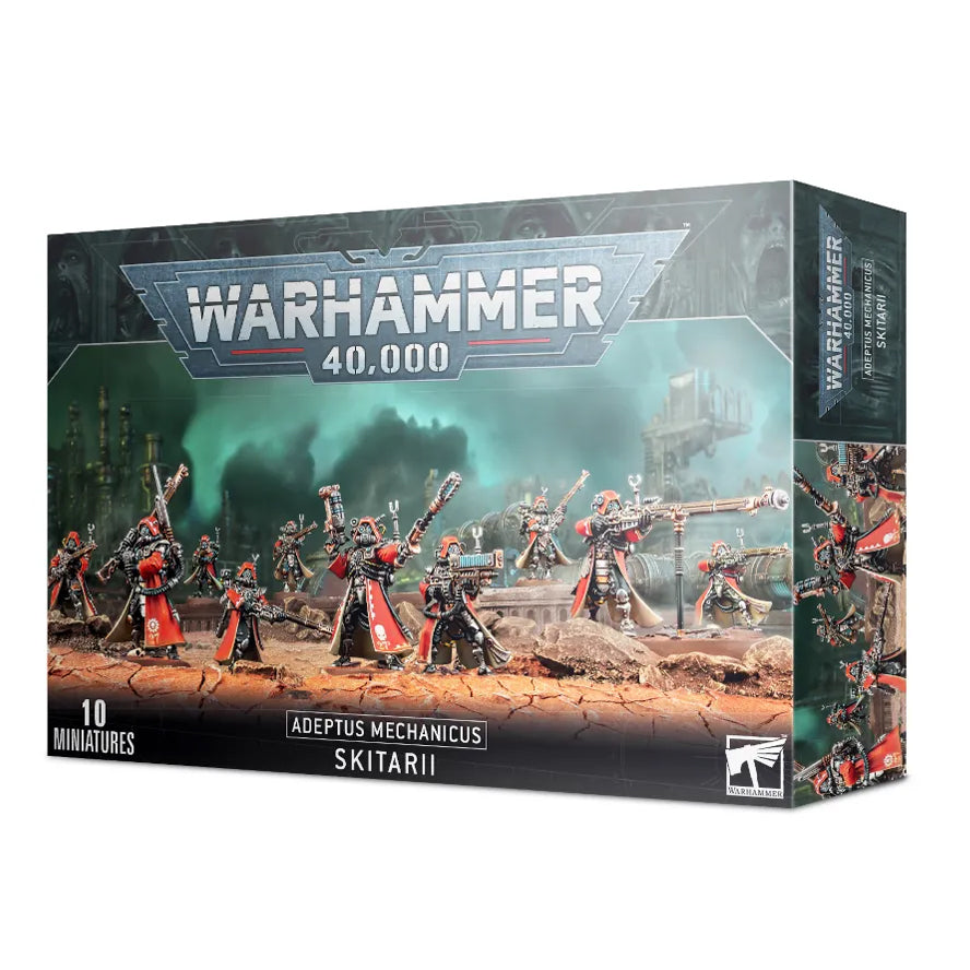 This multi-part plastic kit contains everything needed to make either ten Skitarii Rangers or ten Skitarii Vanguard. Included in the box are 124 components - twenty-three heads, eleven of which are Skitarii Rangers, twenty-five weapons, a small transfer sheet one Citadel 60x35.5mm Oval Base and ten Citadel 25mm Round Bases.